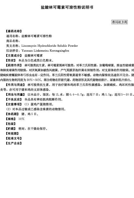 林可胺類抗生素。用于治療豬和雞的革蘭氏陽性蔭感染,如豬痢、雞壞死性腸炎等,亦可用于豬和雞的支原體感染。