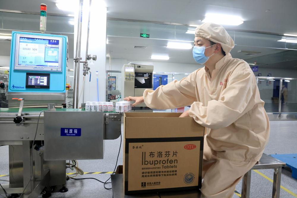 在公司遠安口服制劑車間,布洛芬生產線一刻不停地運轉,該產品可用于緩解感染新冠病毒后出現的發熱、頭痛、四肢酸痛等癥狀。另外,對乙酰氨基酚片、復方氨酚烷胺膠囊、福爾可定糖漿等藥品也都在園區加緊生產。