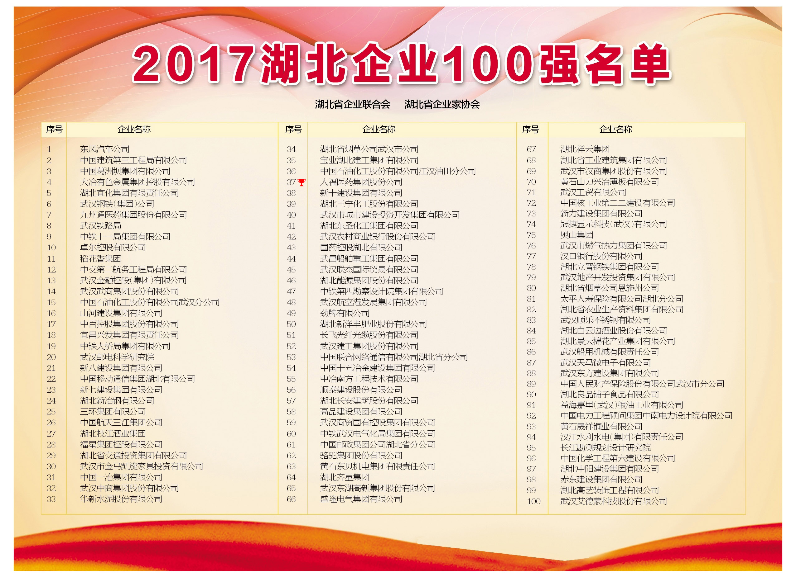 ?????? 7月6日,湖北省企業(yè)聯(lián)合會(huì)、湖北省企業(yè)家協(xié)會(huì)在漢發(fā)布2017湖北企業(yè)百?gòu)?qiáng)。東風(fēng)汽車、中建三局、葛洲壩集團(tuán)排名前三。人福醫(yī)藥此次排名第37位,較去年的排名上升了8位。
