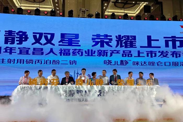 ?7月17日,宜昌人福藥業注射用磷丙泊酚二鈉(商品名:磷丙芬)、咪達唑侖口服溶液(商品名:曉兒靜)全國上市發布會在武漢隆重舉行。